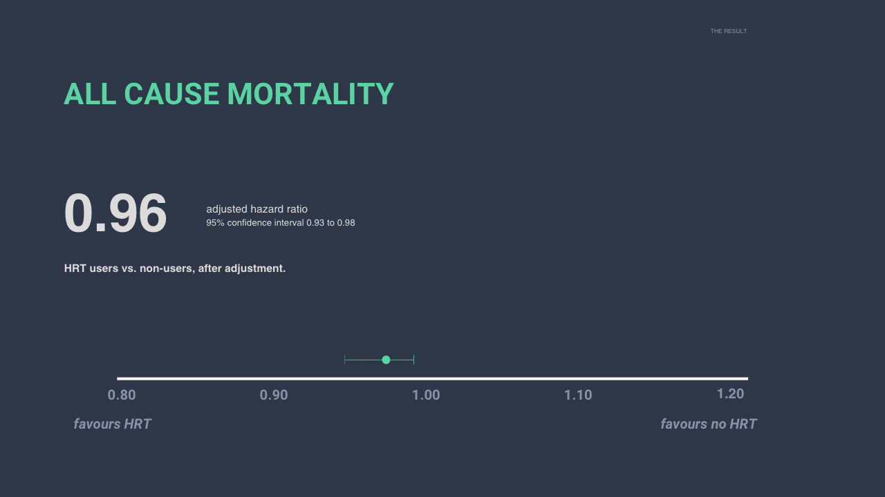 After adjustment for age, parity, education, income, country of origin, and comorbidities including diabetes, hypertension and cardiovascular disease, the adjusted hazard ratio for all-cause mortality among HRT users was 0.96 (95% CI 0.93 to 0.98).¹ In other words, no signal of excess mortality.