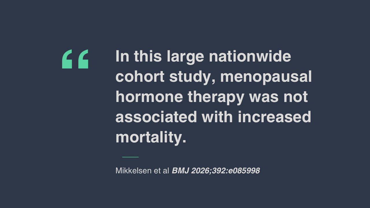 Mikkelsen AP, Bergholt T, Lidegaard Ø, Scheller NM. Menopausal hormone therapy and long term mortality: nationwide, register based cohort study. BMJ. 2026;392:e085998. doi:10.1136/bmj-2025-085998