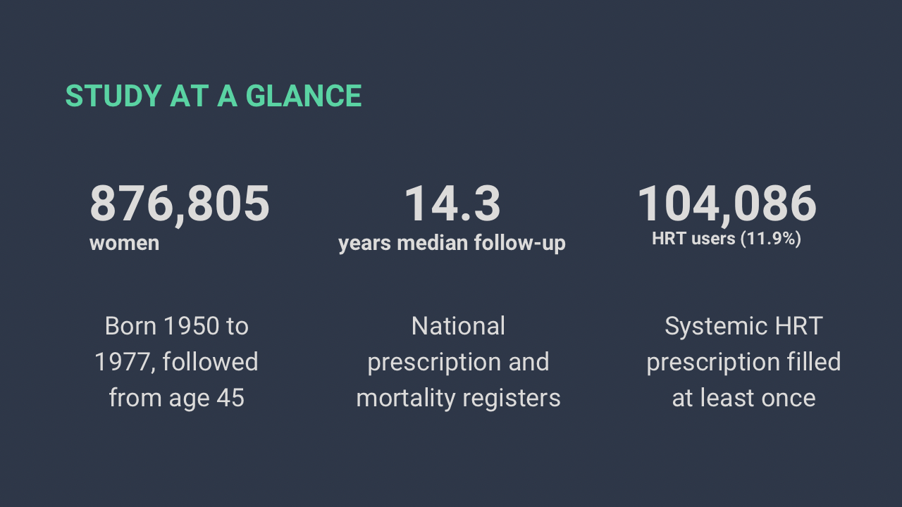 Researchers at Copenhagen University Hospital followed every Danish woman born between 1950 and 1977 who was alive at her 45th birthday. That gave them a cohort of 876,805 women, tracked through national prescription and mortality registries for a median of 14.3 years. Of these, 104,086 (11.9%) filled at least one prescription for systemic menopausal hormone therapy.